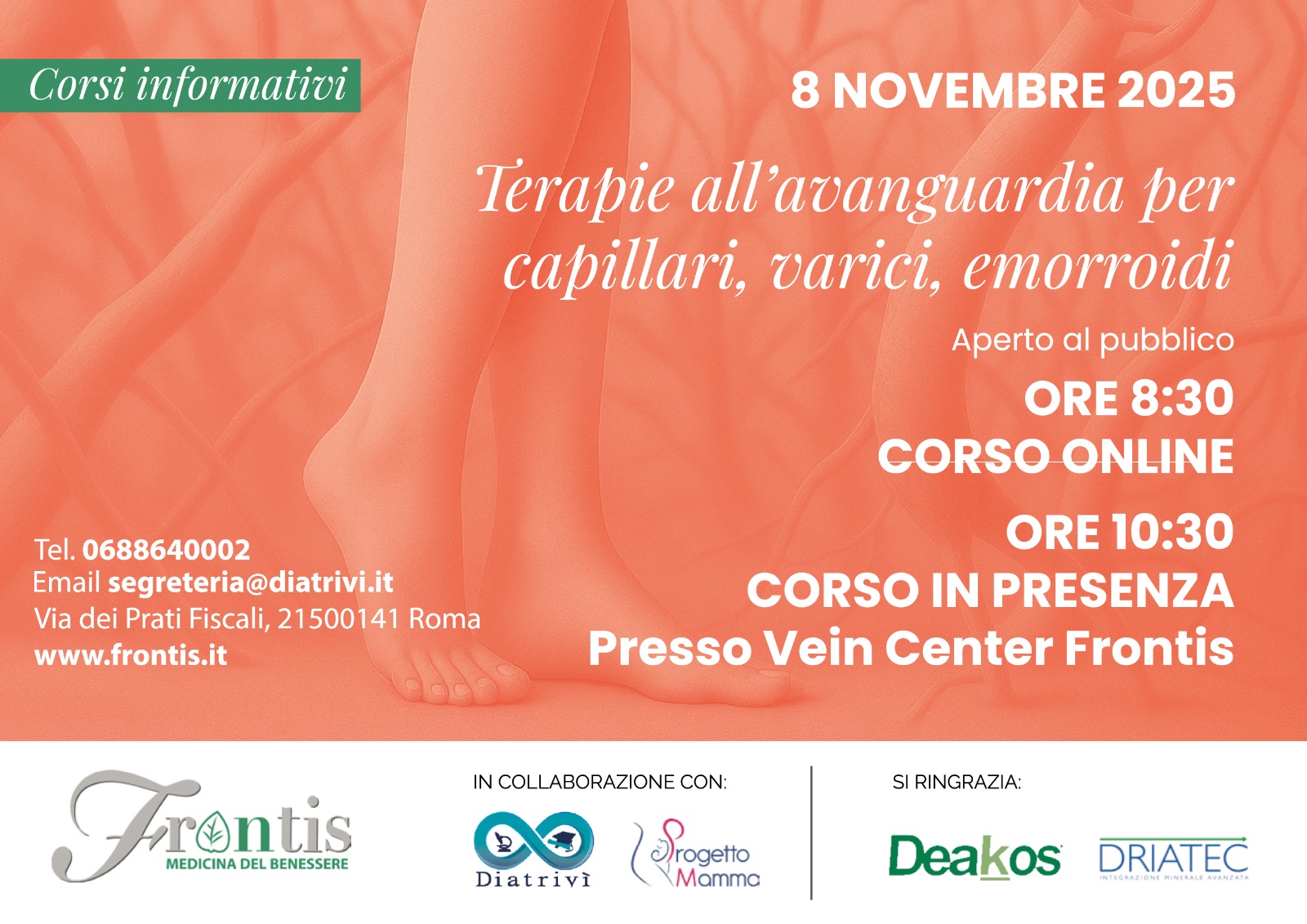 Siamo lieti di annunciare un’importante opportunità formativa dedicata al benessere e alla salute vascolare! L’8 Novembre 2025, prenderà il via un corso informativo approfondito e accessibile, incentrato sulle Terapie all’avanguardia per Capillari, Varici ed Emorroidi.